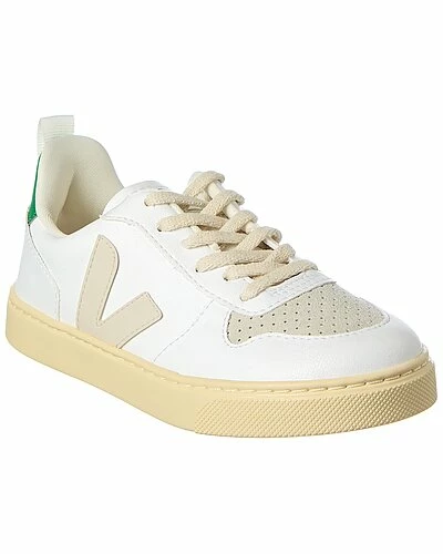 - Small V-10 Sneaker in white, pierre and emerald faux leather with logo accents